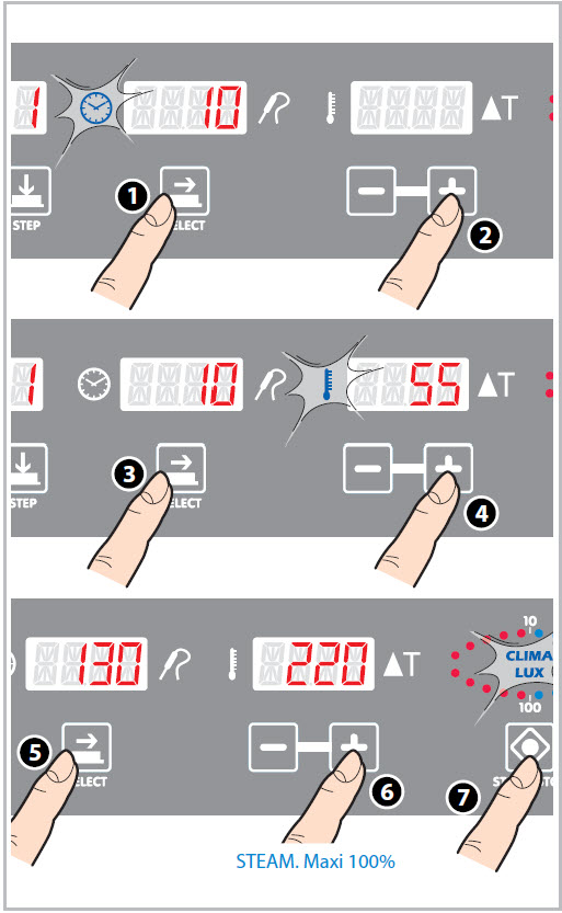 دستگاه را روشن کرده و دما روی 55̊C تنظیم کرده و بخار (STEAM.Maxi) را روی 100% تنظیم کنید.