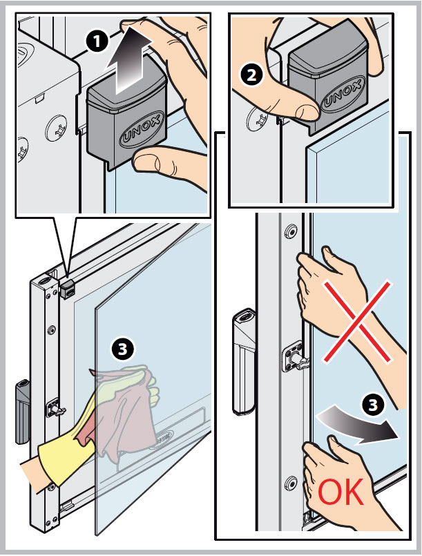 برای جلوگیری از خطرات آسیب های ممکن در اثر حرکت فن، بخار داغ و اعمال شیمیایی مواد شویندهک درب فر را در طول شستوشو باز نکنید.